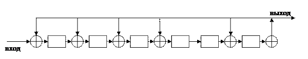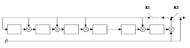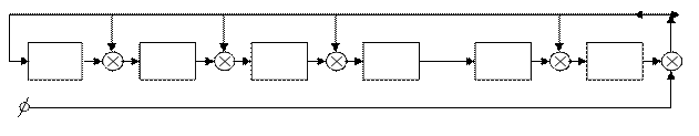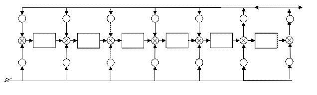 приведена ниже. Прямоугольниками на схеме обозначены элементы памяти, кружочками – устройства умножения на константу, записанную в кружочке, кружочками со знаком «+» обозначены сумматоры. Число элементов памяти равно степени равно степени многочленов b(X) и g(X). Цепи сдвига на схеме не показаны.