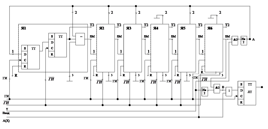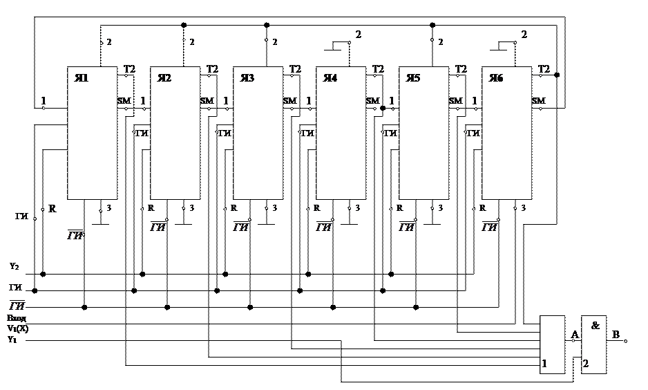 Типовые ячейки от Я1 до Я6 в этой схеме и включение генератора импульсов ГИ то же, что и в схеме кодера. В качестве сумматора по модулю 2 на входе первой ячейки, один вход которого подключен к точке, на которую последовательно во времени поступают сигналы кода, второй – к выходу ячейки Я6, используется сумматор по модулю 2, имеющийся в составе ячейки Я6.