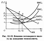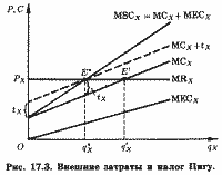 в точке Е*, т. е. там же, где цена уравнивается с предельными общественными затратами. Теперь затраты предприятия, генерирующего отрицательный внешний эффект, будут складываться из затрат на оплату применяемых факторов производства и налоговых выплат. Налог Пигу побудит эти предприятия учитывать внешние затраты и ограничить прибылемаксими-зирующий выпуск общественно оптимальным уровнем.