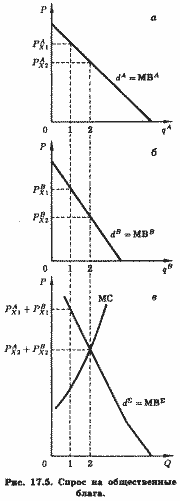 Допустим для простоты, что на данной улице проживают лишь два человека, А и В. Они же являются и единственными потребителями уличного освещения. На рис. 17.5, а представлена кривая индивидуального спроса А на уличное освещение, dA