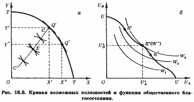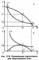 Графически эффективная аллокация в производстве общественного, X, и частного, Y, благ представлена на рис. 17.6. На рис. 17.6,а кривая ТТ представляет кривую продуктовой трансформации, или кривую возможностей производства частного и общественного блага, а кривая UA