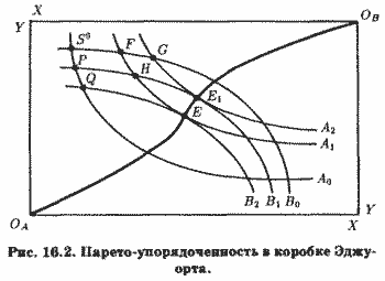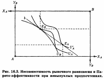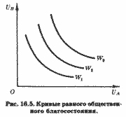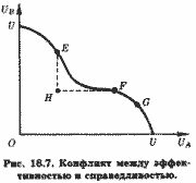 ≈ одну из кривых безразличия субъекта А. Если он выберет на этой кривой некоторую точку с, ее координаты будут соответствовать определенной комбинации обоих благ. Оставшееся количество частного блага be достанется субъекту В. Это его количество отображено на рис. 17.6, б сегментом b'с'. Выполнив подобную процедуру для всех точек кривой безразличия UA
