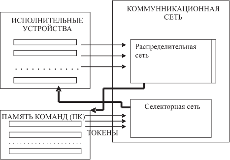 В командах проверки условия возможно альтернативное задание адреса результата (ИЛИ — ИЛИ). Адреса результатов являются адресами ПК, т.е. результаты выполнения одних команд в качестве операндов могут поступать в текст других команд. Команда не готова к выполнению, если в ее тексте отсутствует хотя бы один операнд. Ячейка, обладающая полным набором операндов, переходит в возбужденное состояние и передает в селекторную сеть информационный пакет (токен), содержащий код операции и необходимую числовую и связную информацию. Он поступает по сети на одно из исполнительных устройств. Там же операция выполняется, и в распределительную сеть выдается результирующий пакет, содержащий результат вычислений и адреса назначения в ПК (возможно, за счет выбора альтернативы, т.е. такой выбор — тоже результат). По этим адресам в ПК результат и поступает, создавая возможность активизации новых ячеек. После выдачи токена в селекторную сеть операнды в тексте команды уничтожаются, что обеспечивает повторное выполнение команды в цикле, если это необходимо.