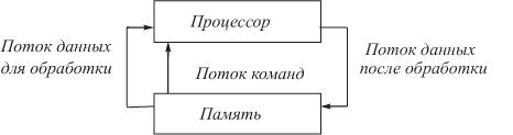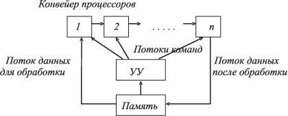 Альтернативной архитектурой является "не-фон-Неймановская" архитектура, допускающая одновременный анализ более одной команды. Поиски ее обусловлены необходимостью распараллеливания выполнения программы между несколькими исполнительными устройствами — процессорами. Счетчик команд при этом не нужен. Порядок выполнения команд определяется наличием исходной информации для выполнения каждой из них. Если несколько команд готовы к выполнению, то принципиально возможно их назначение для выполнения таким же количеством свободных процессоров. Говорят, что такие ВС управляются потоком данных (data flow).Общая схема потоковых ВС представлена на рис. 1.1.1
