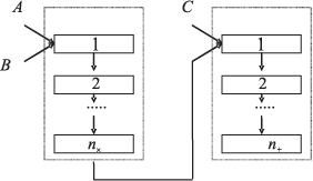 Пусть управляющая система обслуживает несколько объектов, каждый из которых требует затраты производительности P, в соответствии со стадией обслуживания, как показано временными диаграммами на рис.2. Начала обслуживания, а также длительность стадий обслуживания, случайно распределены во времени. На каждой стадии обслуживания используется общее для всех объектов подмножество программ — функциональных модулей. Тогда видно, что если за объектами жестко закреплять процессоры ВС, то их производительность должна удовлетворять самой напряженной последней стадии обслуживания. Если же в соответствии со случайным взаимным смещением этой стадии все множество функциональных модулей, требуемых для всех объектов, динамически распределять между процессорами, то такой пиковой нагрузки на один процессор в среднем можно избежать. То есть можно руководствоваться результирующей диаграммой на основе суммирования тех, что изображены на рисунке.