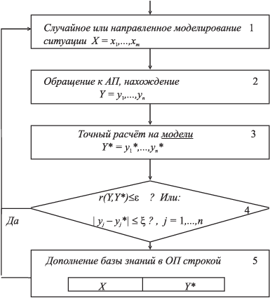 Обучение системы целесообразно проводить на достаточно точной модели, максимально использующей точный расчет компонент решения. Применение модели для обучения используется не только на специально предусмотренном этапе обучения системы, но и вне реального цикла управления, т.е. когда система работает в режиме дежурства, параллельно с функциональным контролем. Тогда алгоритм ее работы представлен на рис. 4.2.2.
