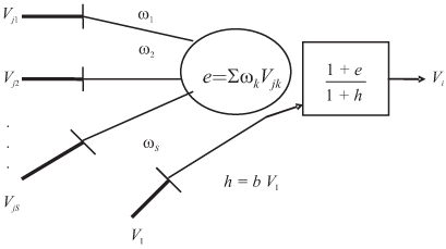 В более сложном случае, например, в одной сети распознавания зрительных образов, где реализовано самоуправление, схема действия нейрона показана на рис. 4.4.2. Это так называемые сигмоидные нейроподобные элементы, более точно моделирующие процессы реального нейрона.