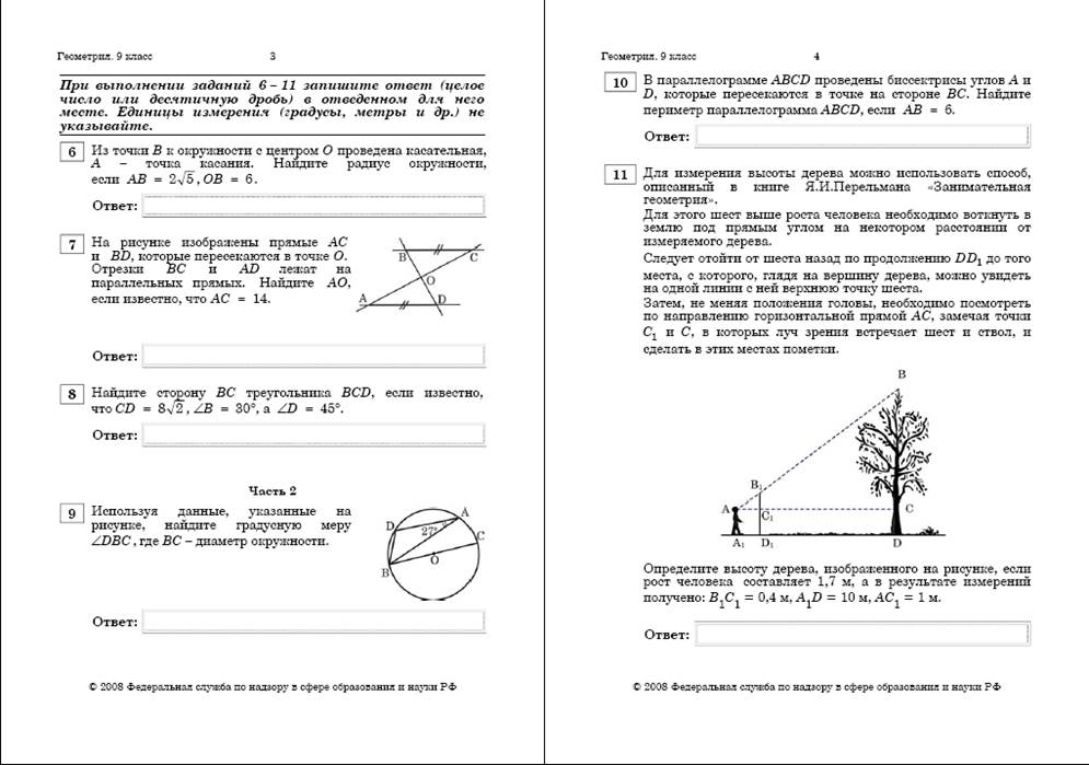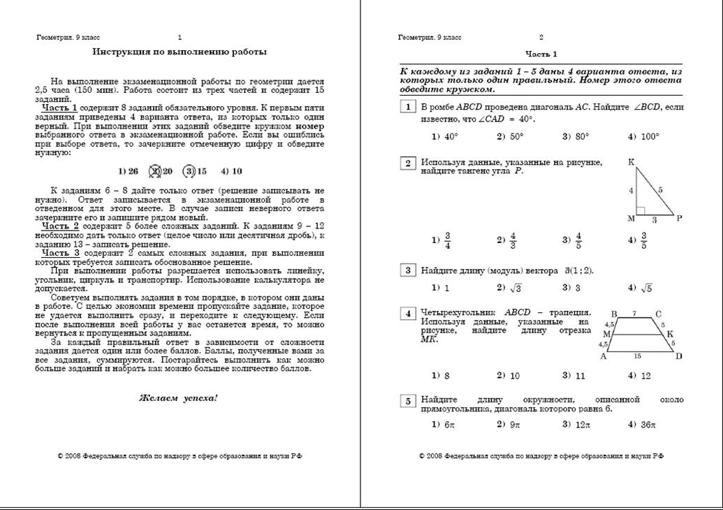 Первая часть направлена на проверку базового уровня подготовки выпускников основной школы. Она состоит из восьми заданий. Каждое задание определяется свойствами одной из фигур планиметрии. С помощью заданий первой части проверяются знания и понимание важных элементов содержания (геометрические понятия, свойства основных фигур), владение основными формулами, умение применять полученные знания к решению геометрических задач. При решении заданий первой части учащиеся должны узнавать стандартные, несложные задачи в разнообразных формулировках.