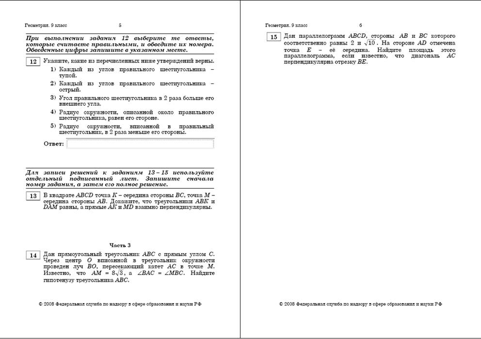 Вторая часть включает пять заданий повышенного уровня. Ученик должен применить свои знания в измененной ситуации, используя известные методы решения геометрических задач. Задания с 9 по 12 – с кратким ответом, задание 13 – с развернутым ответом. Задание с номером 11 носит практический характер. Ученик должен составить математическую модель реальной ситуации. В задании 12 необходимо установить какими из перечисленных свойств обладает правильный многоугольник. Т.е. возможно несколько вариантов ответов. Максимальный балл за это задание равен двум, если указаны все три верных ответа и не указаны ни одного неверного ответа. Один балл ставится, если правильно указаны два верных ответа и при этом указано не более одного неверного ответа. Ноль баллов ставится во всех остальных случаях. Задание с номером 13 проверяет умение выпускника проводить доказательные рассуждения с использованием известных из школьного курса геометрии определений, аксиом и теорем. Необходимо доказать два утверждения. Выпускник должен владеть методами доказательств, способностью к интеграции знаний из различных тем курса планиметрии. Максимальный балл за это задание равен двум.