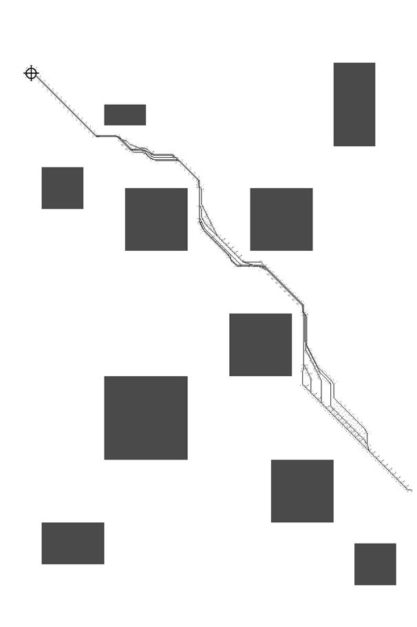 считалась направленной от центра окружности. Траектория ("локомоция") получалась в результате интегрирования уравнений движения второго порядка, так как ускорение, действующее на движущуюся точку, определялось суммой указанных сил. В ходе исследований выяснилось, что инерционность, заложенная в указанную модель, приводит к тому, что траектория движения становится малоприемлемой (препятствие "отбрасывает" движущуюся точку очень сильно и траектория получается чересчур "изрезанной". Для того, чтобы избавиться от этого недостатка и сделать метод годным для случая аппроксимации контуров препятствий другими способами, было предпринято следующее. Во-первых, стали использоваться уравнения движения первого порядка (т.е. действующие силы определяют скорость, по сути дела речь идет об аналоге простого градиентного спуска). Во-вторых, сила отталкивания стала определяться аргументом, равным расстоянию до препятствия. При этом форма контура препятствия произвольна, а для приведенного выше примера это разность r