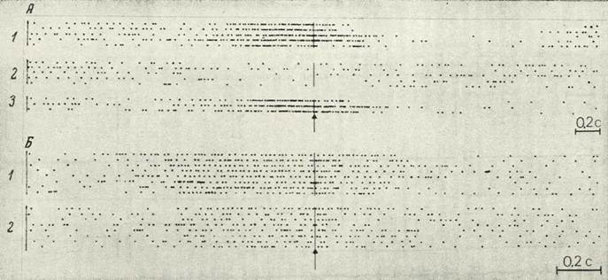 К первой подгруппе относились и нейроны, активирующиеся при подходах к обеим педалям (движение налево у правой стенки камеры и направо у левой) и/или нажатии на них (рис. 2, Б), а также активирующиеся в акте подхода и/или нажатия только на одну из педалей. Рис. 2, А