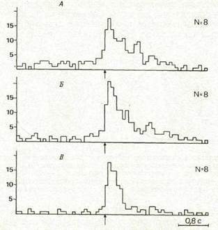 — растры импульсной активности, построенные от момента пересечения носом плоскости отверстия кормушки (момент обозначен стрелками). А