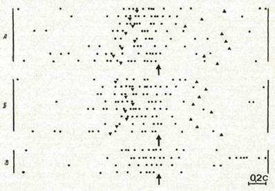 ситуация ЭЭ). Все растры построены от момента начала нажатия на соответствующие педали (обозначен стрелками). Цифры слева от растров — последовательность реализации серий поведенческих циклов. На Л — активация возникает при подходе и нажатии на левую педаль — /, 3,