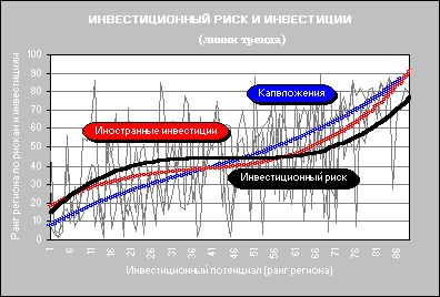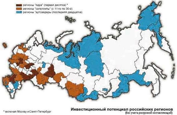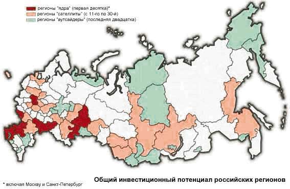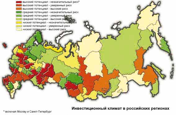 3. Распределение регионов по интегральному рейтингу инвестиционного потенциала показывает, что наибольший вклад в его формирование вносят факторы, накопленные в процессе многолетней хозяйственной деятельности: инфраструктурная освоенность территории, инновационный потенциал и интеллектуальный потенциал населения. В целом Россия относится к числу стран с весьма высоким уровнем инвестиционного риска, что резко снижает ее общий рейтинг. Однако именно по степени риска регионы России наиболее контрастны: от регионов с затухающими или вновь готовыми вспыхнуть вооруженными (Чеченская республика) и социально-политическими (Кемеровская область) конфликтами до вполне благополучных регионов с авторитетной властью (Татарстан и Нижегородская область).