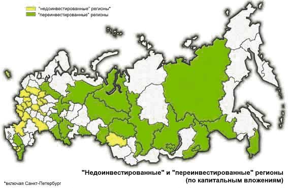 Рис. 16. Недоинвестированные и переинвестированные регионы (по иностранным вложениям) ……………………………………………………………………………………42