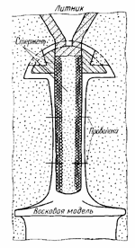В период поздней бронзы (конец II тысячелетия—первые века I тысячелетия до н. э.) в Грузии происходит дальнейший подъем металлургии и литейного дела. Появляются различные сплавы, совершенствуются литейные формы: даже в каменных формах устраиваются газоотводные каналы, выпора п т. п. Получает дальнейшее развитие литье по восковым моделям. Ф. Н, Товадзе установил оригинальную технологию литья рукоятки меча с применением восковой модели (рис. 4).