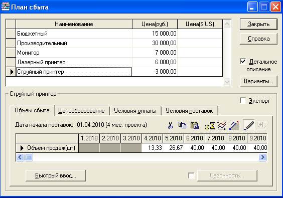 После завершения формирования инвестиционного плана следует перейти к созданию операционного плана Его важнейшей составляющей является «План сбыта», реализуемый с помощью одноименного модуля раздела «Операционный план». Принимается, что в результате маркетингового анализа компьютерного рынка в регионе установлены рекомендуемые цены и объемы сбыта продукции создаваемого предприятия. В соответствии с полученными результатами маркетингового анализа введем в модуле «План сбыта» цены на все виды продуктов: Бюджетный – 15 000 руб., Производительный – 30 000 руб., монитор – 7 000 руб., лазерный принтер – 6 000 руб. и струйный принтер - 3000 руб.