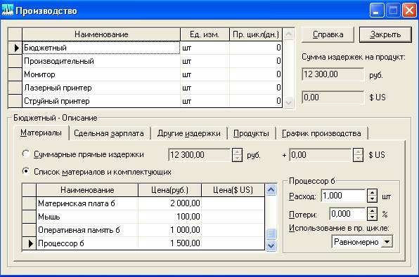 Затем в модуле «План производства» введем для каждого продукта единицы измерения – «Шт.» и производственный цикл - 0 дней. Затем в карточке «Материалы» для компьютеров «Бюджетный» и «Производительный» установим следующие величины стоимости комплектующих в рублях: