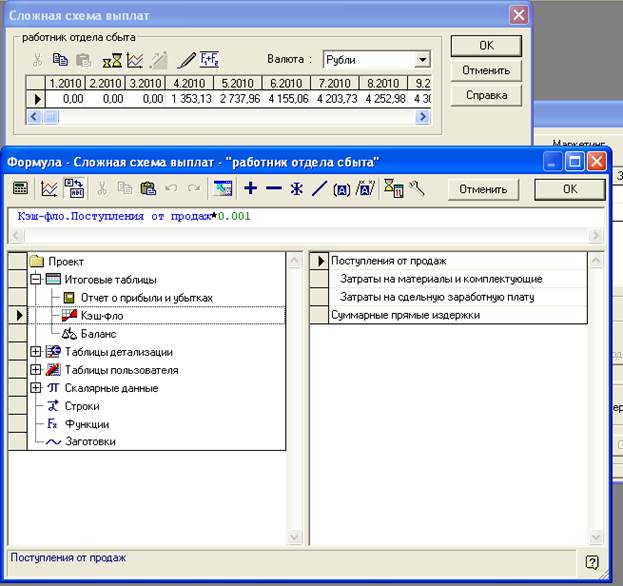 Ввод зарплаты работников отдела сбыта производится с использованием формулы. Для этого в окне «План персонала» выбирается сложная схема выплат и после нажатия кнопки "Схема" появляется окно «Сложная схема выплат», показанное на рис 8. После щелчка по кнопке «Формула» панели инструментов этого окна появляется окно «Формула - Сложная схема выплат», в левой нижней части которого приводятся возможные составляющие части формул. После двойного щелчка по блоку «Итоговые таблицы» открываются его подразделы, в том числе нужный отчет "Кэш-фло".