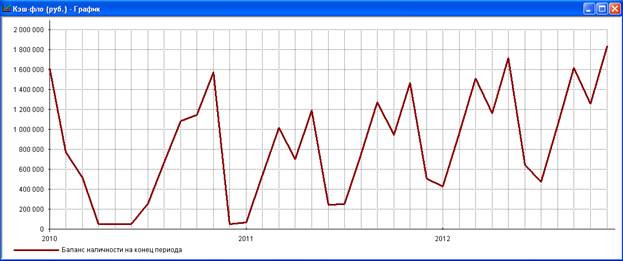 На основании анализа таблиц финансовых отчетов можно получить ряд графиков, наглядно характеризующих изменение финансовых характеристик проекта за время его реализации. Из отчета о движении денежных средств можно получить график баланса наличности, показанный на рис 11.