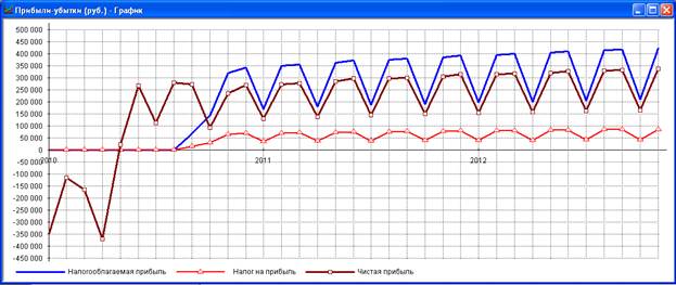 Из отчета о прибылях и убытках построим график изменения налогооблагаемой прибыли, налога на прибыль и чистой прибыли за время реализации проекта, показанный на рис. 12.