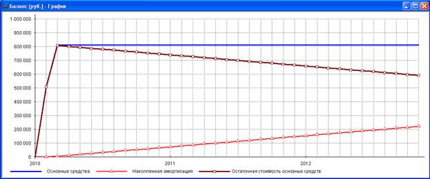 Из отчета по балансу предприятия получим график изменения стоимости основных средств и накопленной амортизации, показанный на рис. 13.