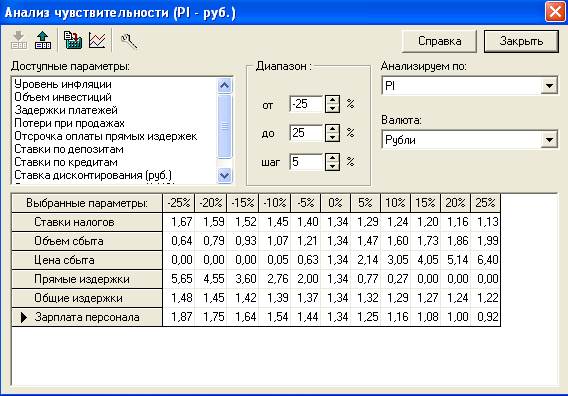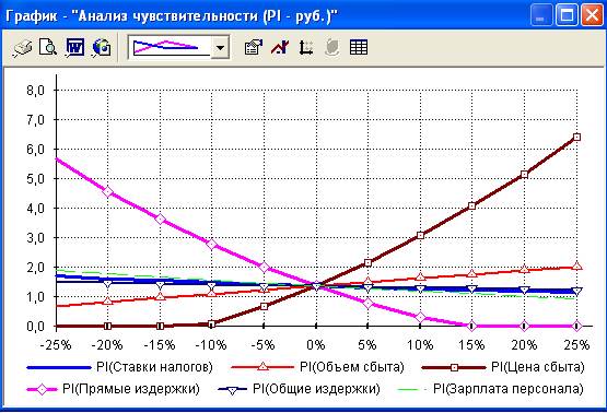 При проведении анализа чувствительности в качестве варьируемых параметров выберем ставки налогов, объём сбыта, цены сбыта, прямые издержки, общие издержки, зарплату персонала. Диапазон варьирования параметров от - 25% до +25%. Результаты анализа влияния изменений параметров на индекс прибыльности PI показаны на рис. 18.