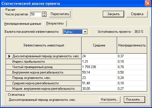 Итак, устойчивость проекта равна 38%, что свидетельствует о необходимости проведения дополнительных мероприятий по повышению устойчивости проекта для гарантированного достижения высокой эффективности инвестиций при производстве новых продуктов.