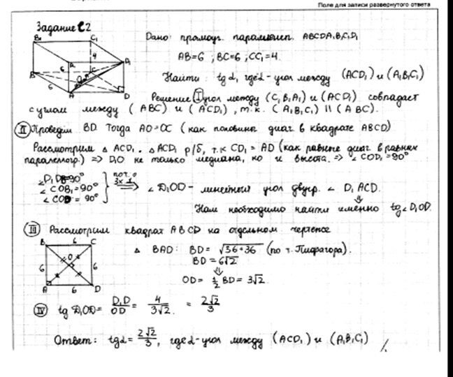 Ход решения понятен. Автор допускает ошибку в одной формуле: , вместо , что приводит к неправильному ответу. Из текста невозможно однозначно понять, рассматривает ли ученик обе конфигурации, или ограничивается только случаем острого угла. По крайней мере, отсутствует даже минимальное указание на то, что для тупых углов подсчет аналогичен.