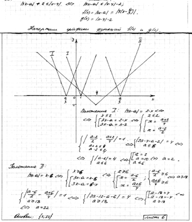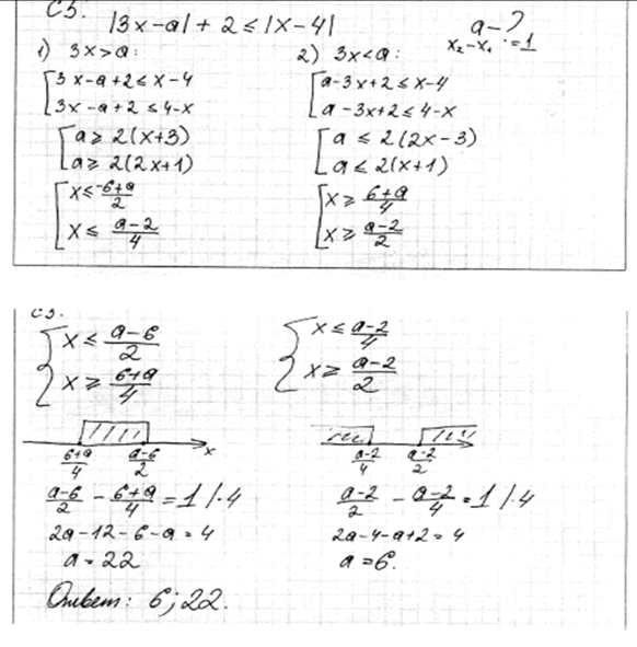 Тем не менее, на первом фрагменте текста (до систем) - все верно: использована равносильность . Есть и арифметическая ошибка во втором неравенстве второй совокупности в первом случае. Тем не менее, «Верно рассмотрены все случаи раскрытия модулей. При составлении или решении условий на параметр допущены ошибки, в результате которых…»