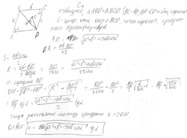 · для вычисления искомого расстояния используются некоторые хотя и стандартные, но не слишком часто употребляемые в задачах факты, такие как местонахождение центра описанной окружности, соотношение между вписанным и центральным углами, еорема синусов (для нахождения радиусов окружности);