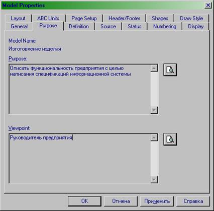 IDEF0-модель предполагает наличие четко сформулированной цели, единственного субъекта моделирования и одной точки зрения. Для внесения области, цели и точки зрения в модели IDEF0 в CASE-средстве BPWin следует выбрать пункт меню Edit/Model Properties,