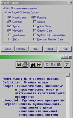 Результат описания модели можно получить в отчете Model Report. Диалог настройки отчета по модели вызывается из пункта меню Report/Model Report. В диалоге настройки следует выбрать необходимые поля, при этом автоматически отображается очередность вывода информации в отчет (рис. 2).