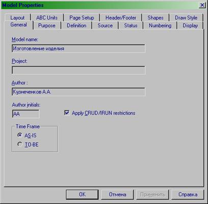 того же диалога можно описать статус модели (черновой вариант, рабочий, окончательный и т. д.), время создания и последнего редактирования (далее отслеживается автоматически). В закладке Source описываются источники информации для построения модели (например, "Опрос экспертов предметной области и анализ документации"). Закладка General служит для внесения имени проекта и модели, имени и инициалов автора и временных рамок модели - AS-IS и ТО-ВЕ.