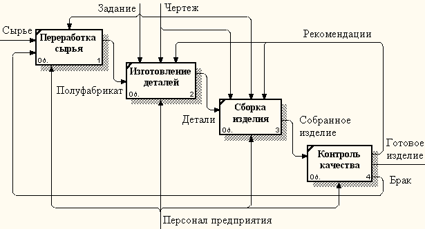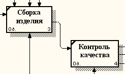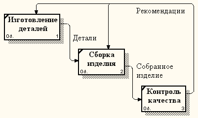 , когда выход нижестоящей работы направляется на управление вышестоящей (стрелка "Рекомендации", рис. 11). Обратная связь по управлению часто свидетельствует об эффективности бизнес-процесса. На рис. 12 качество изделия может быть повышено путем непосредственного регулирования процессами изготовления деталей и сборки изделия в зависимости от результата (выхода) работы "Контроль качества".