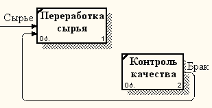 , когда выход нижестоящей работы направляется на вход вышестоящей. Такая связь, как правило, используется для описания циклов. На рис. 11 стрелка "Брак" связывает работы "Переработка сырья" и "Контроль качества", при этом выявленный на контроле брак направляется на вторичную переработку.