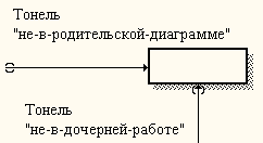 Тоннелирование может быть применено для изображения малозначимых стрелок. Если на какой-либо диаграмме нижнего уровня необходимо изобразить малозначимые данные или объекты, которые не обрабатываются или не используются работами на текущем уровне, то их необходимо направить на вышестоящий уровень (на родительскую диаграмму). Если эти данные не используются на родительской диаграмме, их нужно направить еще выше, и т.д. В результате малозначимая стрелка будет изображена на всех уровнях и затруднит чтение всех диаграмм, на которых она присутствует. Выходом является тоннелирование стрелки на самом нижнем уровне. Такое тоннелирование называется "не в родительской диаграмме".