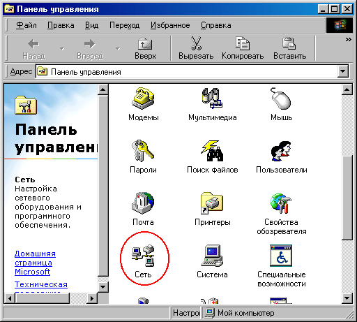 На панели управления находим ярлык "Сеть" (я обвел его красным кружочком):