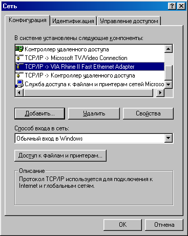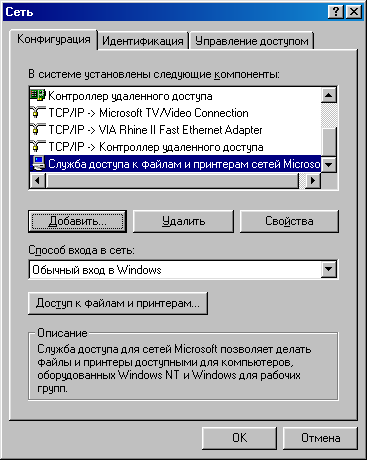 Если мы хотим иметь только Internet, настройка закончена. Однако наряду (а в изолированной сети - вместо) Internet обычно используются собственные средства Microsoft для локальных сетей - общие диски и принтеры. Следует помнить, что они не относятся ни к Internet как глобальной сети, ни к Intranet как применению технологий Internet в локальных сетях.