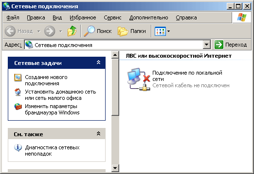 Если драйвер сетевой карты уже установлен, то, скорее всего, вы увидите значок "Подключение по локальной сети". Обратите внимание на то, что у автора значок перечеркнут красным и написано "Кабель не подключен". Это не мешает дальнейшей настройке и всего-навсего означает, что в момент написания этой главы у автора были выключены все компьютеры, кроме одного, и хаб тоже.