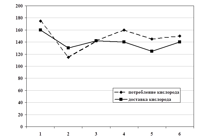 Полученные нами данные показали, что на всех этапах периоперационного и послеоперационного периода доставка кислорода и его потребление превышали критический уровень (рис.3).