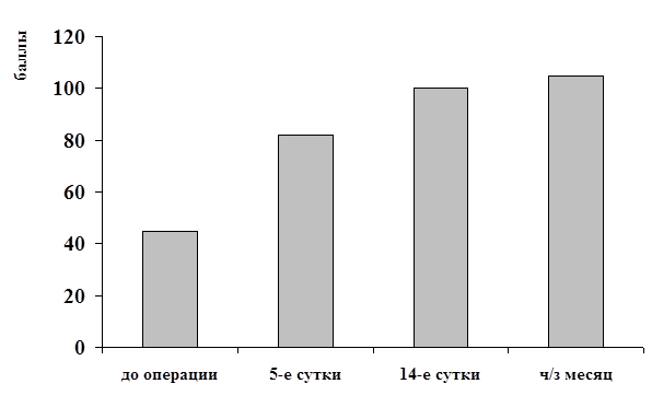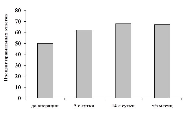 При исследовании психофизиологических характеристик у оперированных больных наблюдалось в послеоперационном периоде улучшение когнитивных функций ЦНС: рост устойчивости внимания, улучшение процессов мышления (рис.4).