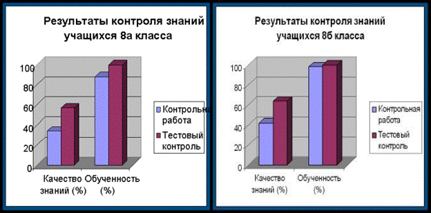Анализируя результаты контроля знаний учащихся, я пришла к выводу, что использование заданий тестового контроля дает более высокое качество знаний и охватывает больший объём материала определенной темы.