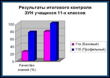 Подготовку к Единому государственному экзамену я начинаю с первых уроков в 8-х классов. В классах предпрофильной подготовки, т.е. в 9-х классах подготовка идёт, практически, одинакова, так как количество часов отводимых на изучение предмета химии одинаковое. А вот начиная с 10-х классов, когда происходит формирование классов по уровням на профильный и базовый, количество часов отводимых на изучение химии разное. В базовом классе подготовка к ЕГЭ осуществляется на занятиях элективного курса, а вот в профильном классе на обычных уроках. В профильном классе после изучения определённой темы я провожу тестовый контроль, выбирая задания по данной теме для контроля из сборников ЕГЭ, тем самым осуществляется подготовка к сдаче экзамена в форме ЕГЭ. Приведу результаты итогового тестового контроля за курс средней школы в профильном и базовом классах.