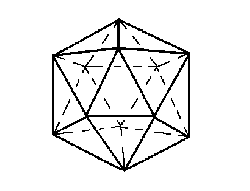 Икосаэдр составлен из двадцати равносторонних треугольников. Каждая его вершина является вершиной пяти треугольников. Сумма плоских углов при каждой вершине равна 300 градусов. Таким образом икосаэдр имеет 20 граней, 12 вершин и 30 ребер.