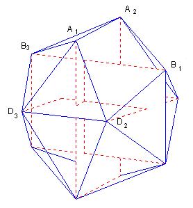 Несколько сложнее убедиться в существование правильного многогранника, соответствующего символу (3, 5), т. е. многогранника с треугольными гранями, сходящимися по пять в каждой вершине. Возьмем три равных золотых прямоугольника, т.е. прямоугольника с соотношением сторон ( +1)/2. Расположим их во взаимно перпендикулярных плоскостях, как показано на рисунке 17. Пусть стороны золотых прямоугольников для определенности равны + 1 и 2. Возьмем произвольную вершину А1