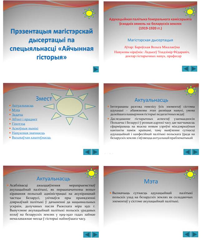 Тема магистерской диссертации – «Адукацыйная палiтыка Генеральнага камiсарыята ўсходнiх зямель на беларускiх землях (1919-1920 гг.). Презентация доступна для просмотра по адресу: