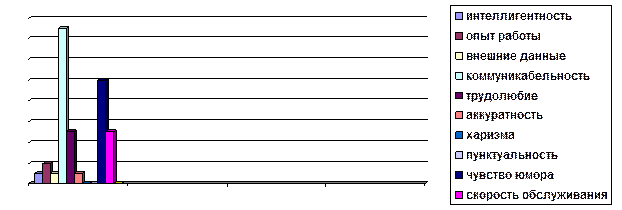 Как видно из диаграммы 1 на первые позиции вырываются такие качества как – коммуникабельность, чувство юмора, скорость обслуживания и трудолюбие. Эти данные заключают в себе совокупность ответов посетителей кафе и сотрудников кафе, те факторы, которые они ставили на первые места.