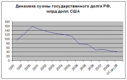 В абсолютном выражении российский внешний государственный долг на 1 октября 2008 года составил 40,4 млрд долларов, что является одним из самых низких показателей в Европе. По относительным показателям, российский внешний госдолг составляет 8 % от объема ВВП страны. Для сравнения — после кризиса 1998 года, внешний долг России составлял 146,4 % от ВВП. В перспективе, по принятому трехлетнему бюджету на период 2008—2010 гг., госдолг должен сократиться до 2,5 % от ВВП.