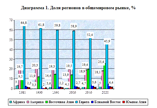 Долгосрочные перспективы развития индустрии туризма представляются специалистам оптимистическими. Ожидается, что к 2010 г. в мире будет путешествовать 1 млрд чел., а к 2020 г. - 1,5 млрд чел. и доходы от гостинично-туристских услуг составят примерно 2 трлн долл. (Табл. 2, 3) [4, 6, 7, 9, 13].